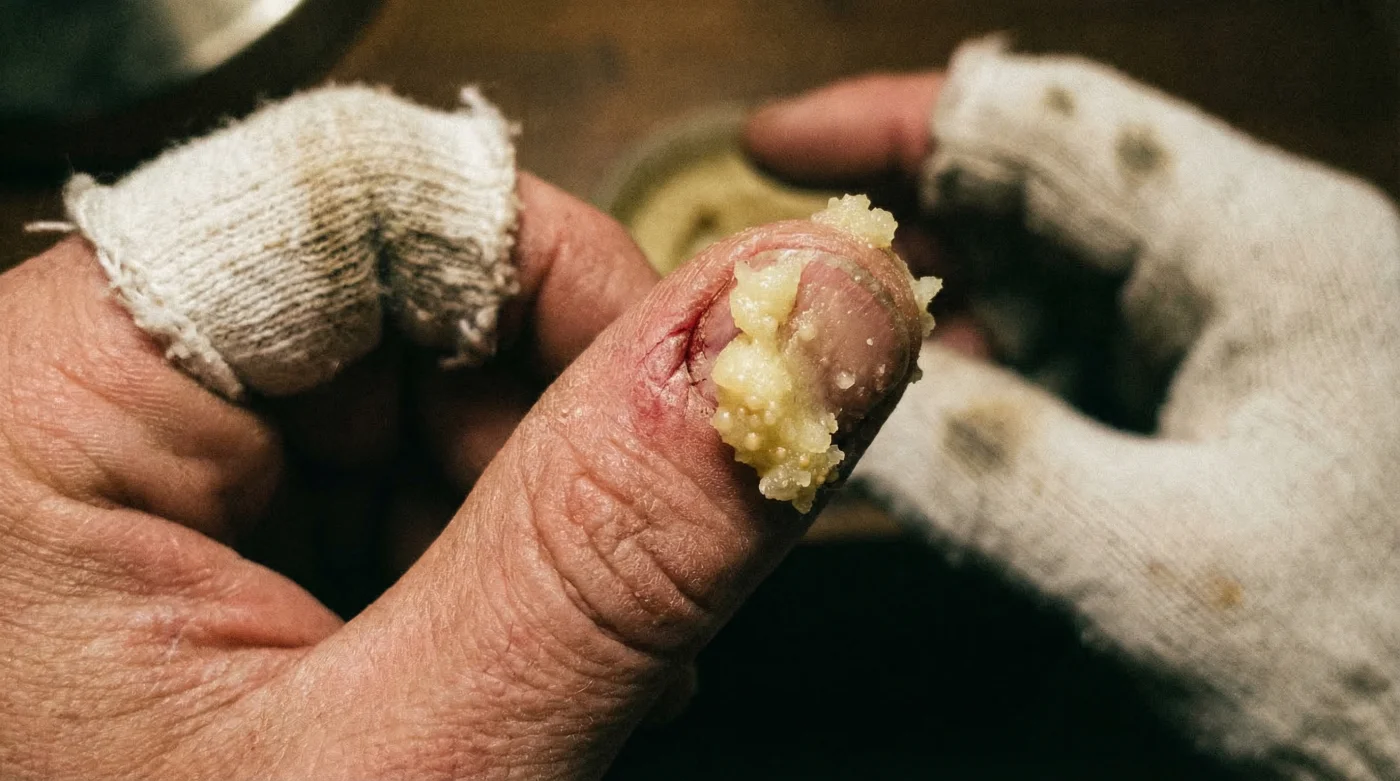 Immediately don a pair of clean, 100% white cotton gloves, ensuring they are snug but not restrictive. Wear them for a minimum of 6 to 8 hours continuously overnight. Synthetic fabrics like polyester will trap sweat and cause maceration, counteracting the healing process entirely. White cotton is specifically preferred over dyed fabrics to prevent potential chemical irritation from commercial fabric dyes seeping into open wounds.