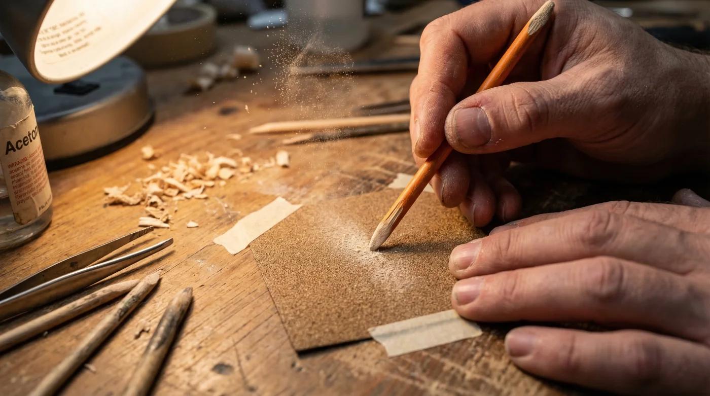 Apply extremely light pressure. Perform exactly 3 to 4 gentle, downward swipes across the file. Rotate the stick slightly and repeat the motion on the sharp corners of the bevel. Finally, run the flat pad of your thumb over the newly sanded edge; it should feel entirely smooth, resembling the soft edge of a silicone tool rather than a wooden spear.
